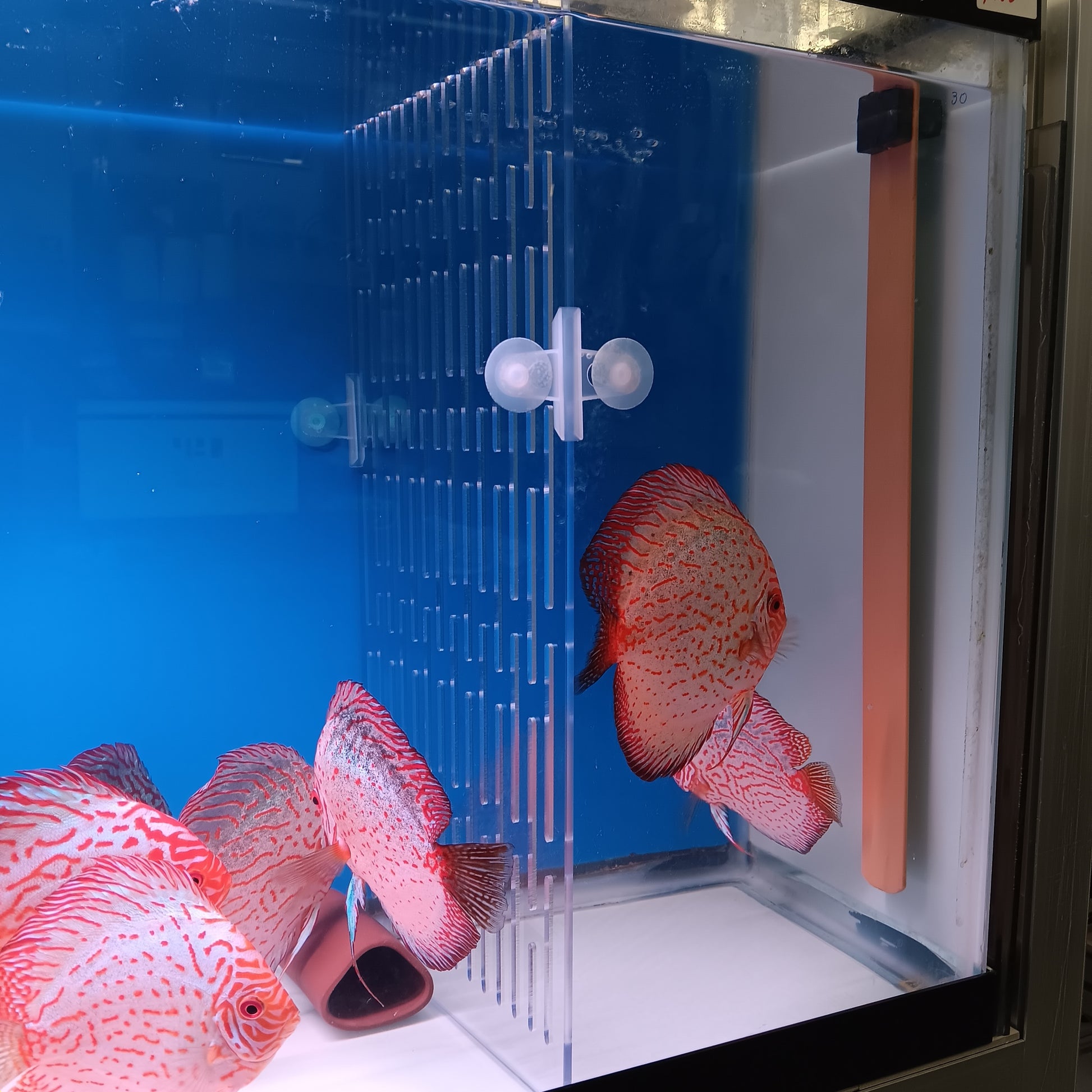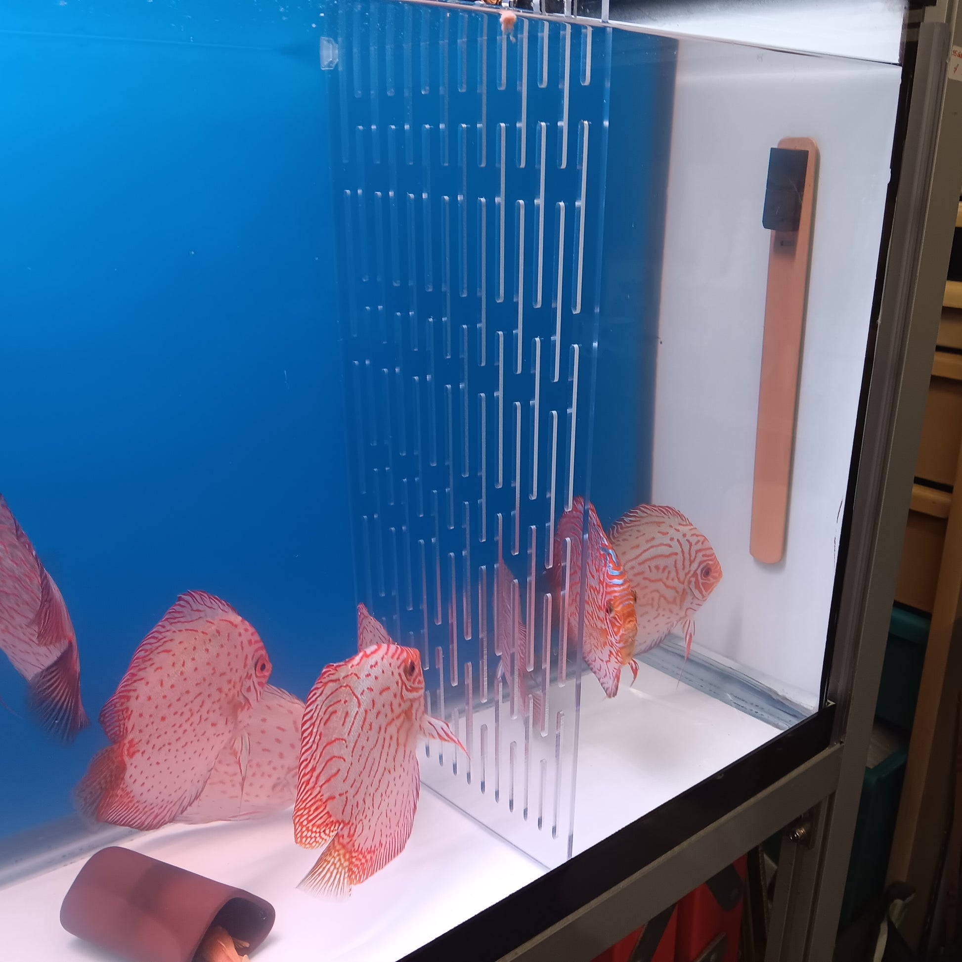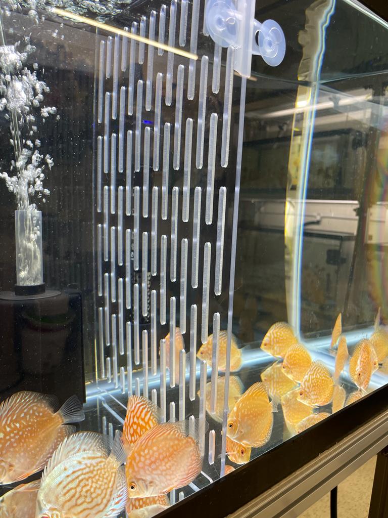 When parents of small discus fight over the control of the fry, the best solution isn’t removing one parent from the tank. Instead, install a clear plastic divider.